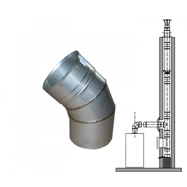 Koleno 45°. Součást komínových vložek, vhodné pro vložkování komínů, pro odvod spalin z topných zařízení na plyn, topný olej. Koleno lze použít při nerovnostech v komínové tělese, nebo jako napojovací koleno od spotřebiče.