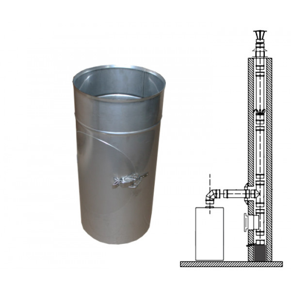 Dvířkový díl - čistící nebo také revizní. Součást komínových vložek, vhodných pro vložkování komínů, pro odvod spalin z topných zařízení na plyn, topný olej nebo tuhá paliva. Slouží k vybírání sazí., nebo revizní otvor